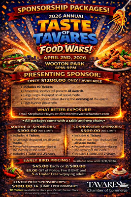 Tavares FL, 32778https://www.tavareschamber.com/events/details/2026-taste-of-tavares-food-wars-business-expo-6488