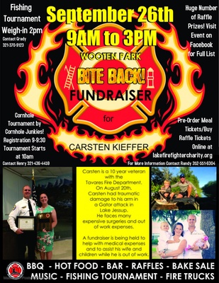 Carsten is a 10 year veteran with the Tavares Fire Department. On August 20th, he had traumatic damage to his arm in a gator attack in Lake Jessup. He faces many surgeries and out of work expenses. A fundraiser is being held to help with medical expenses and to assist his wife and children while he is out of work.